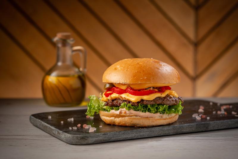 Black bun, burger sauce, mayonnaise sauce, coleslaw, beef, cheddar, bacon, tomato, red onion