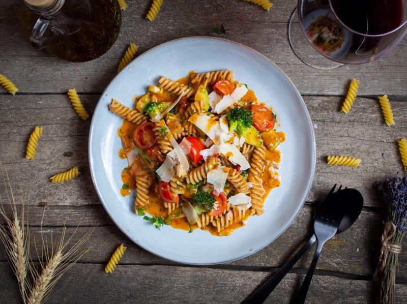 : Fusili integral, broccoli, mushrooms, dried tomatoes, truffle paste, cherry tomatoes, parmesan, spices