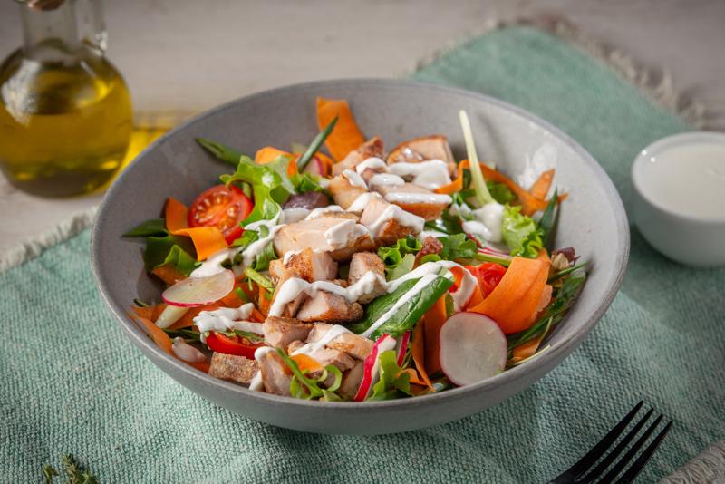 morcovi, ridichi, rosii cherry, salata, ulei de masline, pulpa de pui gatita la grill, sos iaurt
